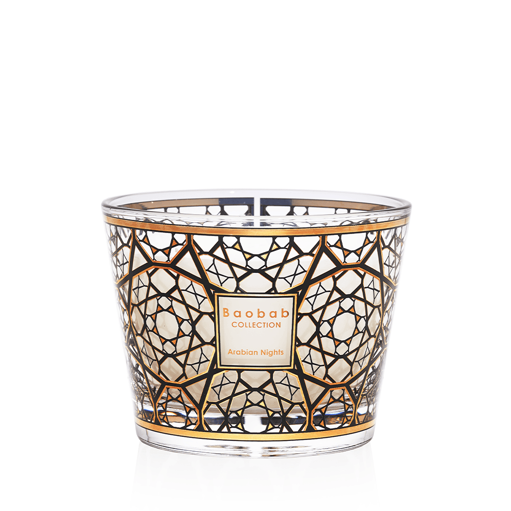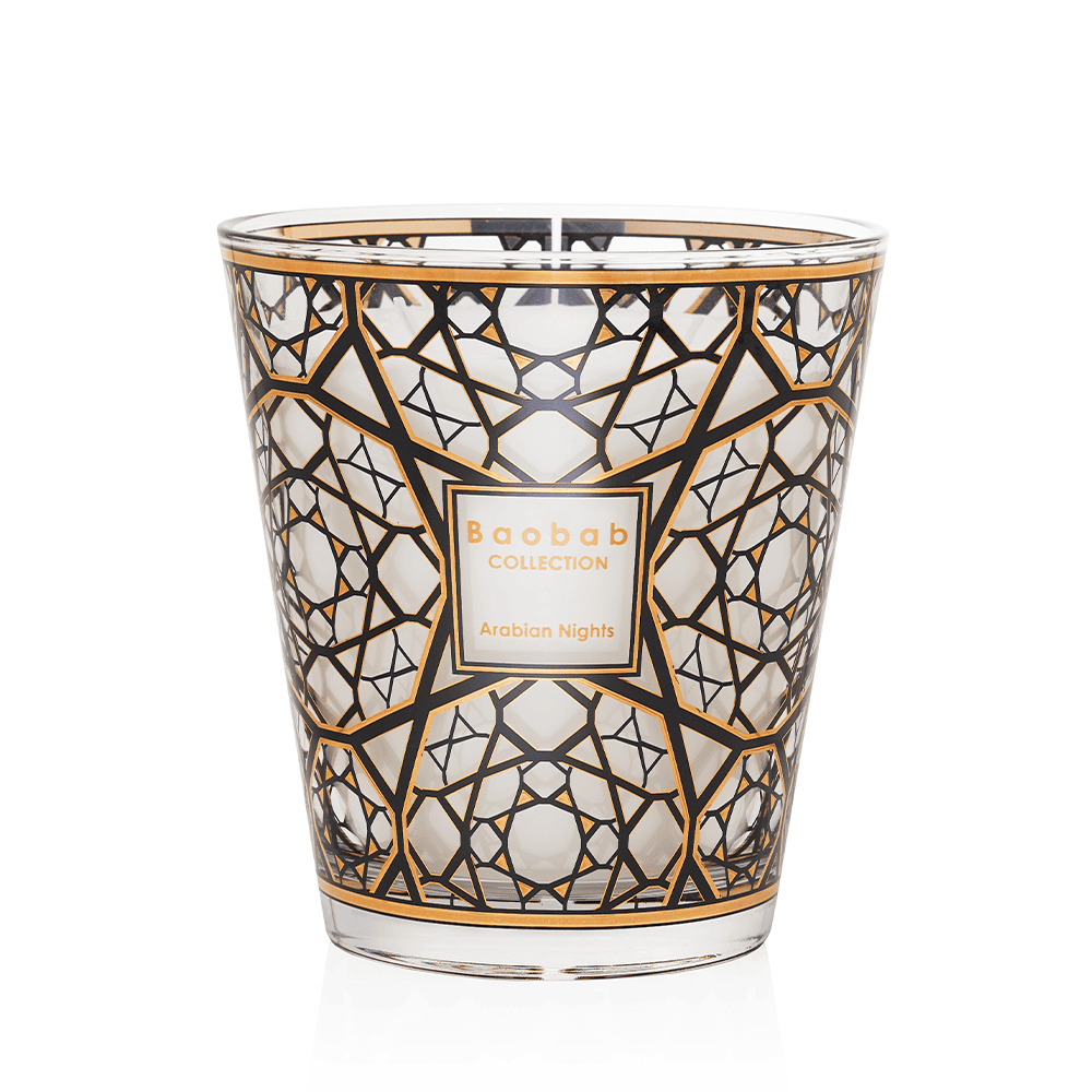 De Baobab Collection Arabian Nights Candle brengt de sfeer van warme oosterse nachten tot leven met een krachtige, kruidige opening van saffraan, een intens hart van oudh (agarhout) en een diepe basis van wierook die zorgt voor een langdurig, houtachtig en oriëntaals geurspoor. De combinatie van donkere houttonen en rokerige accenten creëert een warme, mysterieuze ambiance in elke ruimte. De kaars is gegoten in mondgeblazen zwart glas met subtiele gouden details en vormt daarmee een stijlvol statement in het interieur. Verkrijgbaar in Max 10, Max 16 en Max 24, elk formaat biedt dezelfde karaktervolle geurbeleving met een brandduur die past bij zowel kleinere als grotere ruimtes.